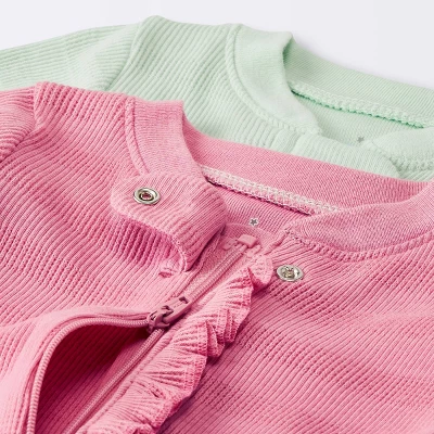 Keep your peanut comfy and covered with this 2-Pack Waffle Sleep N’ Play from cloud island™. This pack of two waffle sleep n’ plays includes one in solid pink with a ruffle detail on the front and one in white for an adorably sweet look. Made from cotton-blend fabric for soft comfort, these long-sleeve sleep ‘n plays come with a built-in footed design to provide full coverage, and the convenient full-length inverted zipper allows for easy dressing and diaper changing. Plus, the safety tab over the top of the zipper protects their chin from scratches.